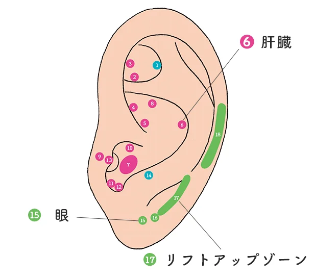 <15>眼(耳たぶのまん中あたり)…疲れ目を改善して目もとのたるみを取り除く。
