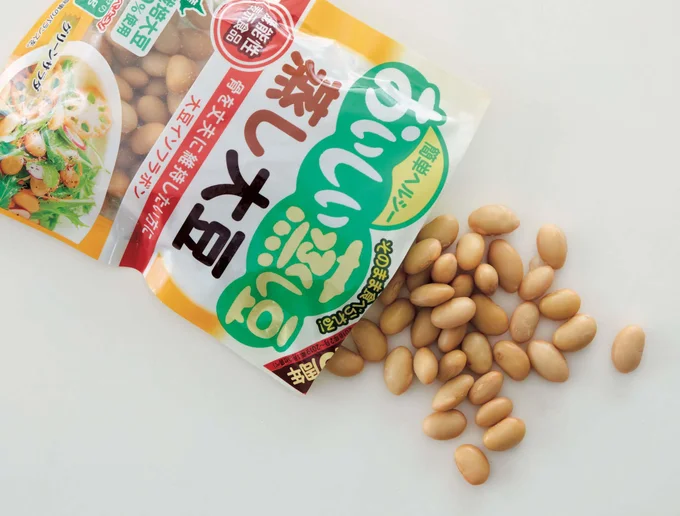 栄養満点の蒸し大豆。ドライパックでストックしやすいのもgood!