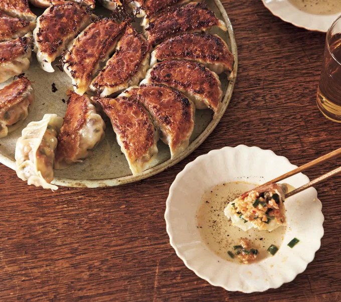 3. フライパンに油大さじ1を強めの中火で熱して餃子を並べる。熱湯1/4カップを加えてふたをして、弱火で約5分焼く。ふたを取って強めの中火にし、水分をとばしながら焼き色がつくまで焼く。器に盛り、酢、こしょう各適量を添える。