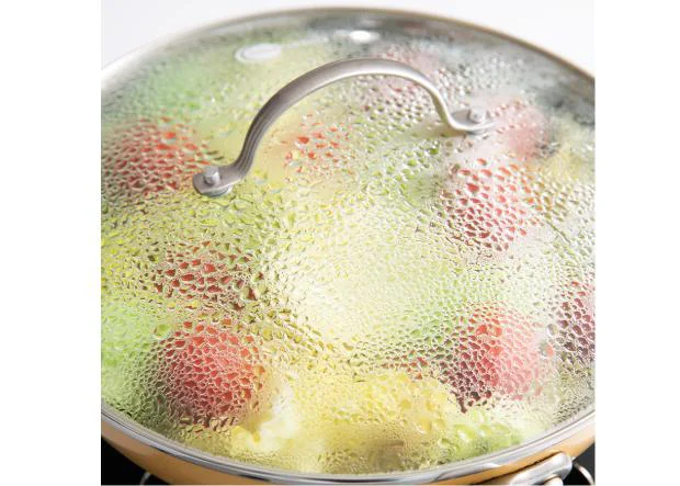 (3)ふたをして中火で約5分、さらに弱火で約5分加熱する。全体を軽く混ぜ、煮汁ごと盛りつける。