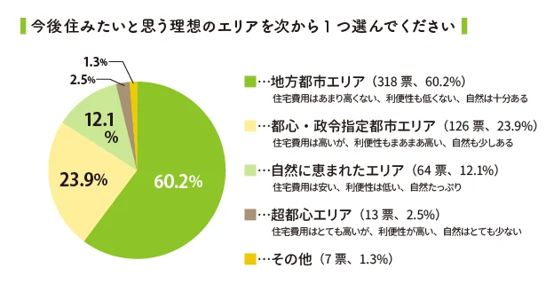 住みたいエリアについては、「地方都市エリア」が6割と最も人気、次いで「都心・政令指定都市エリア」、「自然に恵まれたエリア」、「超都心エリア」の順でした。