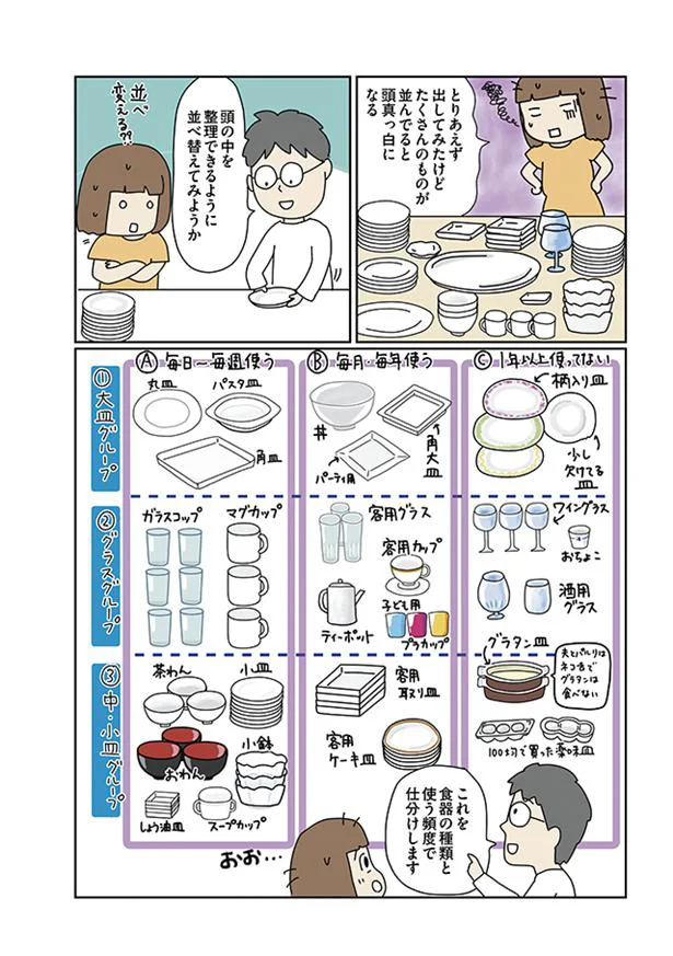 綺麗に収納できてる! と思っていた食器棚。でもこれは「隙間なく入れただけ」の状態で…!?/理系夫のみるみる片付く!整理収納術(9)(画像6/7)