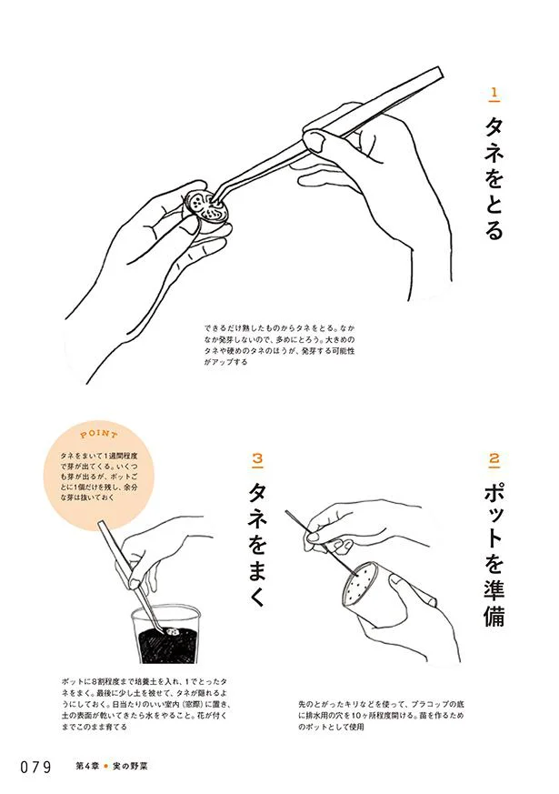 捨てる部分から再生させる、食べずに増やす、タネをとって発芽させるなどの方法で苗を作ります。