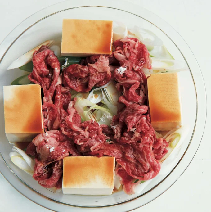 電子レンジ調理のポイントは材料の並べ方と「ふんわりラップ」!じんわ〜り味しみ「肉豆腐」