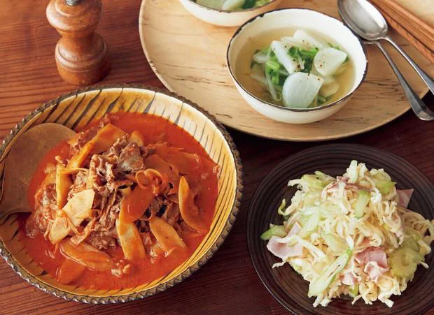 いつもの食材は洋の献立にもイケた! 牛乳でまろやかにまとめた「牛肉とごぼうのトマトクリーム煮」の献立