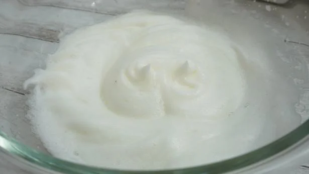 2.卵を白身と黄身にわけ、白身をツノが立つまで泡立てる。