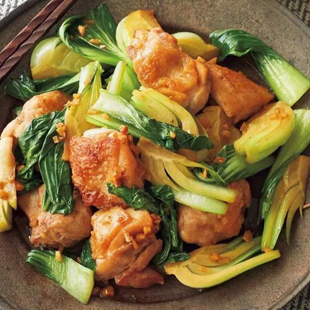 2.フライパンにサラダ油大さじ1を中火で熱し、とり肉を皮目を下にして並べ入れる。約3分焼いて上下を返し、しょうがを加えてさっと炒める。合わせ調味料を回し入れてひと混ぜし、チンゲンサイの軸を加え、約1分炒める。チンゲンサイの葉を加えてさっと炒め合わせる。