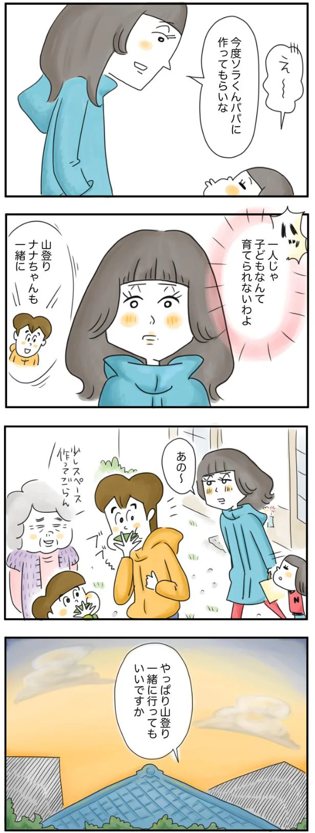 誰にも言えなかった胸の内のつかえを、ふとした拍子におばあちゃんに話してしまったナナちゃんママ。「一人じゃ子どもなんて育てられないわよ」その言葉に押されて、同じ園のソラくんのパパや俊から誘われていた山登りに一緒に行くことを決意しました。