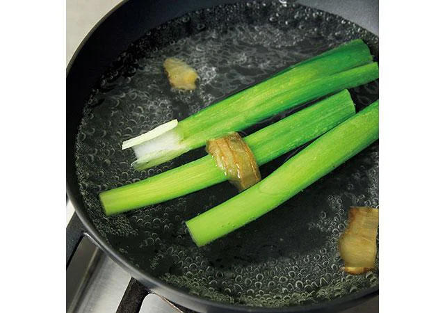 まずはゆでた豚肉をつけるための塩水を作る。大きめのボウルに水2と1/2カップ、塩小さじ1を入れて混ぜる。フライパンにたっぷりの湯を沸かし、ねぎ、しょうがの皮、酒大さじ2を入れる。
