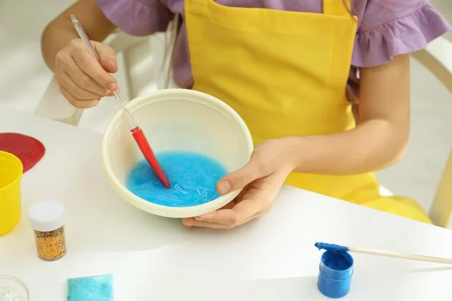 汚れてもいい洋服を着るかエプロンをつける。食紅や絵の具、完成したスライムがつくとなかなか取れないのでお気に入りの服で作業はしない方がいいよ。