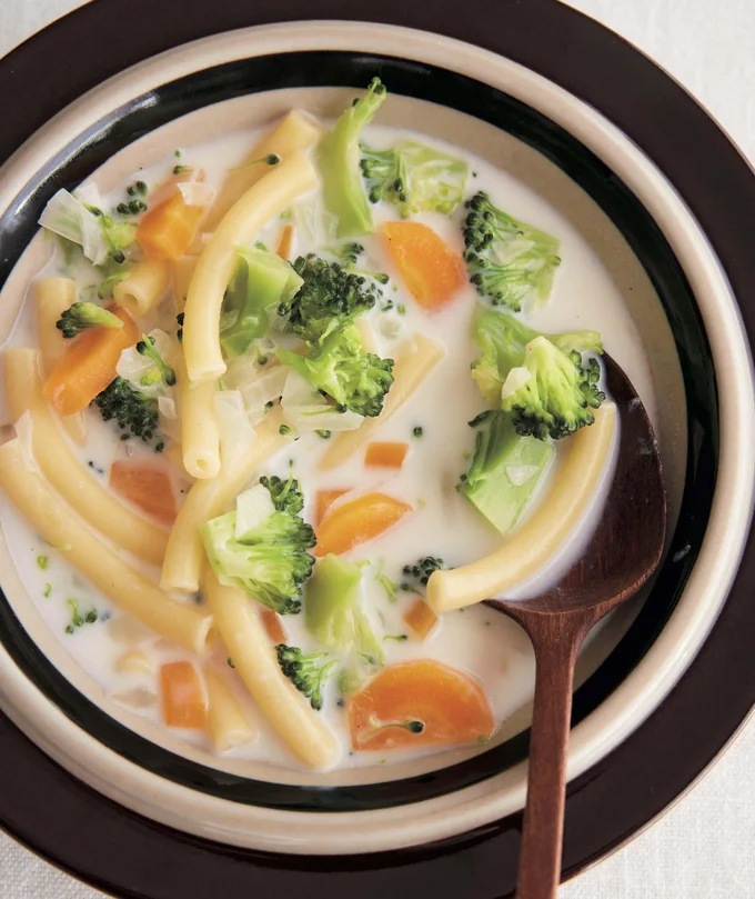 マカロニや野菜入りのまろやかスープに