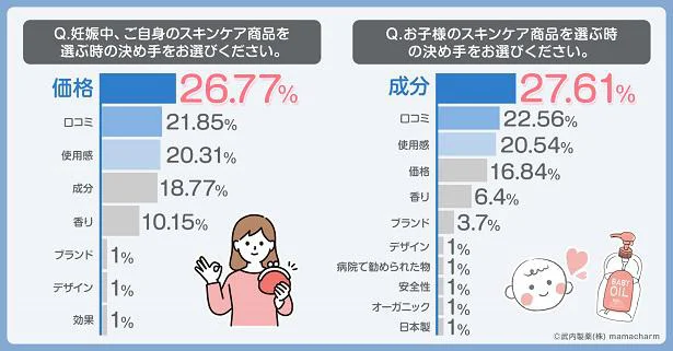 調査では、その回答から「妊娠中は普段より約9割り近くの方がスキンケア・ボディケアへの意識が高まっており、そのうちの約4割はお腹へのケアを気にしている」「妊娠中の自身のケア商品として購入時の決め手となるのは価格が約27%で最も高いが、子どものスキンケア商品に関しては成分が約28%と最も高く、決め手となっている」「約4割の方が妊娠中に受け付けない匂いがある」「良い匂いと感じる香りは約6割が柑橘系」ということがわかったといいます。
