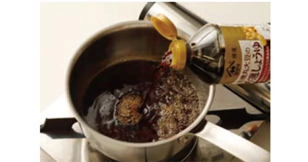 砂糖が溶けたら醤油を入れ、弱火にして10分加熱する。粗熱が取れたら醤油が入っていたボトルや保存瓶に入れ、冷蔵庫で保存する。
