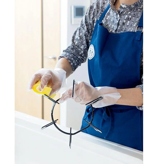 五徳や受け皿など、コンロまわりの外せる部品は中性洗剤で洗って。「食器と同じ感覚で、食洗機に入れてもOK」