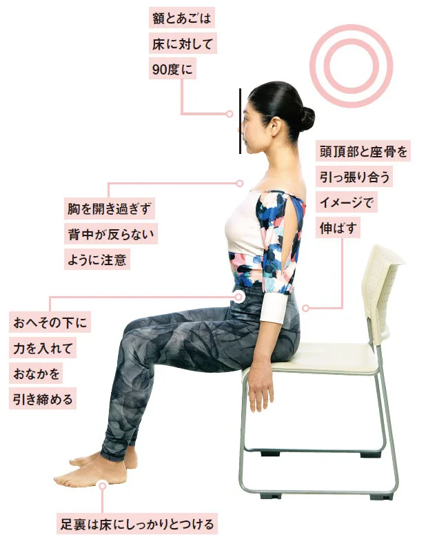 背中を丸めると中心軸が整わない。また足を交差させて座ると顔と体がゆがむ。