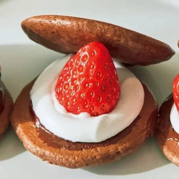 一口サイズのホットケーキで、板チョコ・マシュマロ・いちごをサンド。溶かしたチョコとマシュマロの甘みにいちごの甘酸っぱさが重なって、ついもう1つと手が伸びてしまいます。ココア風味のホットケーキは、ホットケーキミックスにココアを混ぜて。フライパンで生地を焼き、裏返したら板チョコとマシュマロをのせてやわらかくなるまで焼きます。いちごはマシュマロが温かいうちにのせて。