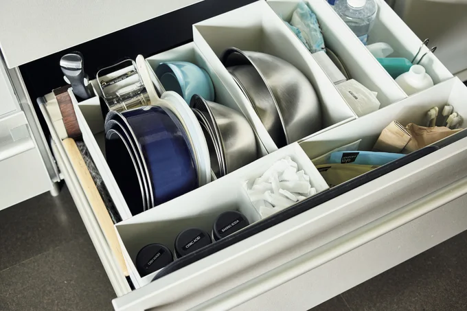 ファイルケースを仕切りにし、ボウルや取っ手を外せるフライパンを重ねて収納。取り出しやすく、省スペースながら収納力もアップ。