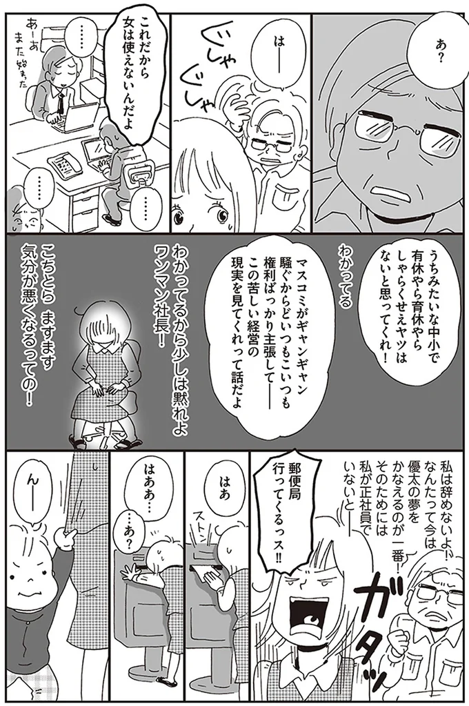 まさかのタイミングで妊娠が判明した美樹絵さん。私が働かないと生活できない。会社はいつまで働ける?ワンマン社長に耐えられる?抱える問題が多すぎて、思わず涙してしまいます。