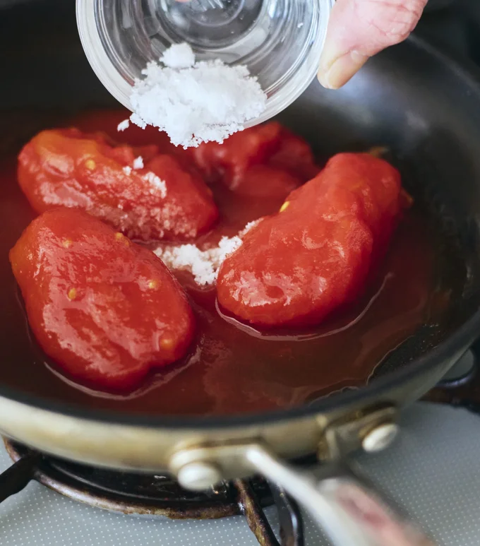 便利な「塩トマソース」は、余ったトマト缶ではなく、もちろん開けたてのもので作っても! 1缶分の場合は、塩は大さじ1、汁けがほぼなくなるくらいを目安に、加熱時間を6〜7分にしてください。