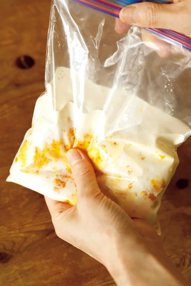 3.ヨーグルト、生クリーム、はちみつを順に加え、袋の上からよくもんでなめらかにし、口を閉じる。