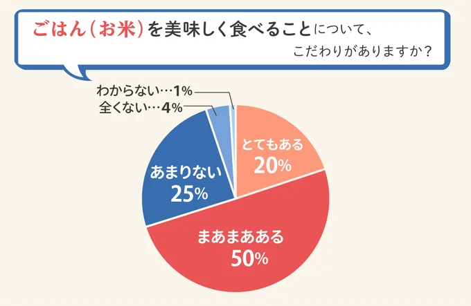 まずは、「ご飯(お米)を美味しく食べることについて、こだわりはありますか?」と聞いたところ、「とてもある(20%)」「まあまあある(50%)」と答えた人が7割にのぼりました。