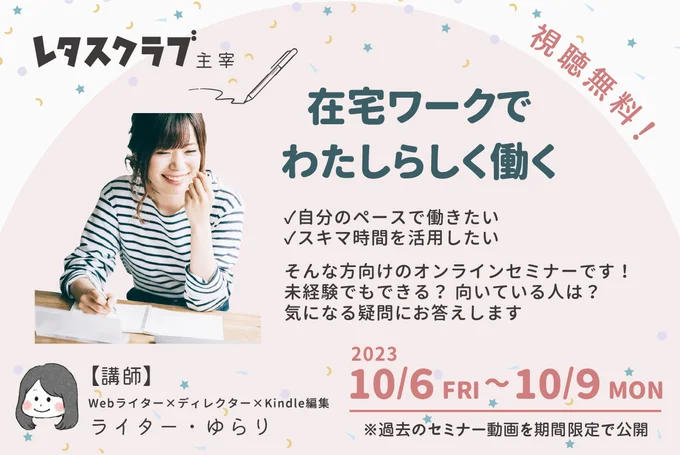 10月6日(金)11:00~10月9日(月)23:59 期間限定『レタスクラブ Webライティングセミナー』セミナー動画無料公開のご案内