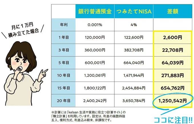 毎月1万円ずつ20年間積み立てたら、銀行の普通預金とつみたてNISAでどのくらい違ってくるでしょうか。2023年8月現在の普通預金の金利は、0.001%。つみたてNISAは、いつ何に投資するかで違いますが、過去のデータから利率4%の複利で計算してみました。20年後にその差はなんと125万円にもなります!