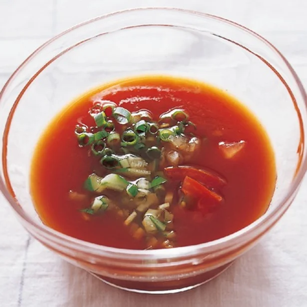 ガスパッチョはスペイン料理の冷たい濃厚なスープのこと。トマトジュースの赤色が映える、甘酸っぱい異国風のつゆです。