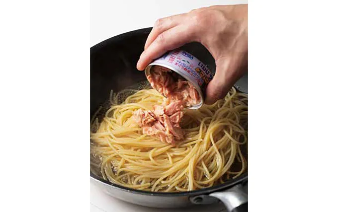 パスタを入れたフライパンに白だし、オリーブオイル、ツナ(汁ごと)、ゆで汁を入れて弱めの中火にかける。2人分を一度に作る場合、水分が煮詰まりにくいためゆで汁を150mlにし、塩気のある調味料を1.5倍、その他の材料を2倍にする。