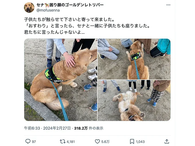 ゴールデンレトリバーのセナくんとお散歩していた「セナ・困り顔のゴールデンレトリバー(@mofusenna)」さんは、数人の子どもたちに犬を触らせてほしいと声をかけられました。