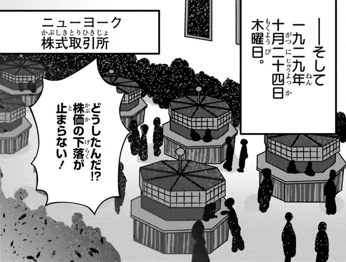1929年10月24日木曜日、好景気に沸くアメリカで突然全ての株が大暴落を始めます。次々に銀行や企業、工場が倒産。街は失業者であふれかえり、アメリカ社会は破綻状態に陥ります。その影響は世界中に広がり「世界恐慌」を巻き起こすことに…。その後、各国は経済を立て直すために「ブロック経済」という排他的な経済圏を作りはじめ、世界の分断が進みます。