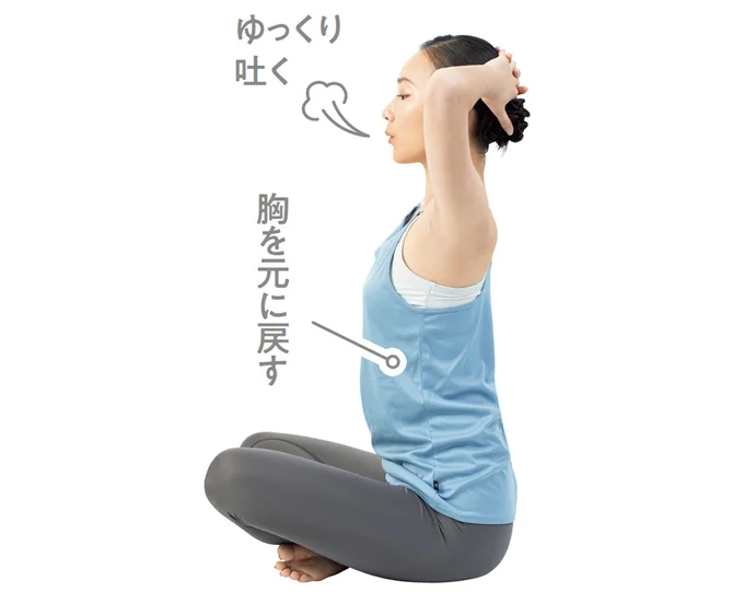 口からゆっくりと息を吐きながら、背中を起こしていき、胸を元の位置に戻します。