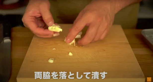 にんにく1片は皮付きのまま両端を落として、包丁で潰します。