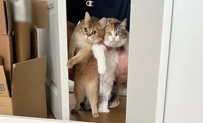 それもそのはず。容器の中にはすでに他のネコちゃんが入っており、こたつちゃんが入ったことで、通勤ラッシュの電車のようなギュウギュウの状態になったのです。