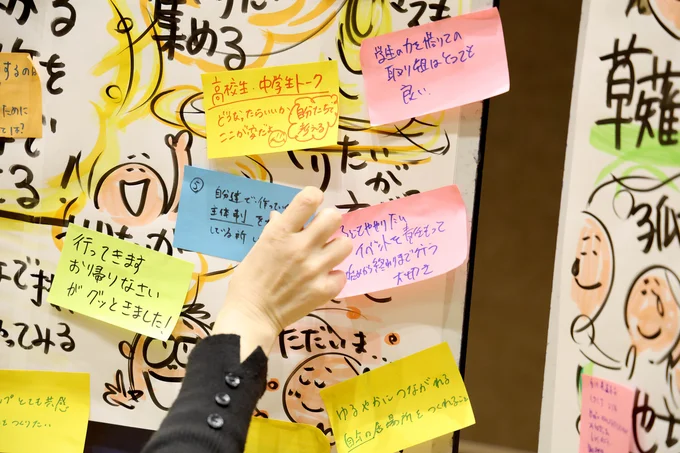 第二部では、こどもまんなか応援サポーターとして活動する6つの団体が意見交換を行いました。各団体の発表で気になったこと、いいなと思ったことなどを付箋に書いて、イラストボードに貼っていきます。