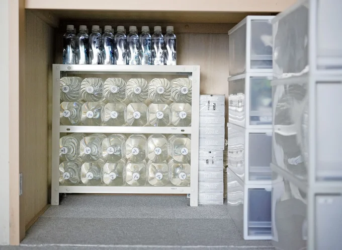「わが家は4人家族なので、2Lペットボトルで18本以上を、押入れの奥に収納。棚には賞味期限をラベリングし、ローリングストックをしながら備えています」