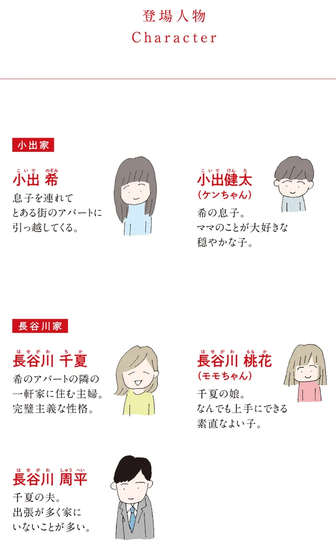 ひとり息子の健太を連れ、アパートの2階に引っ越してきた小出希(のぞみ)。見知らぬ土地で働くため、息子も新しい保育園へ。シングルマザーとしての新生活に、さまざまな不安を抱えていました。