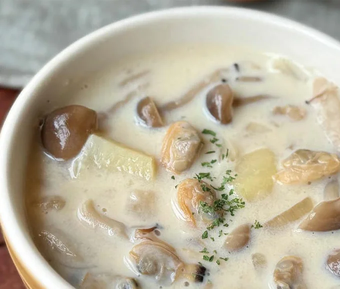 【鍋で10分】お腹の調子が整う!きのこたっぷり腸活スープ「きのこクラムチャウダー」