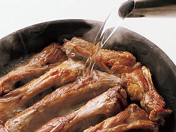 3.煮汁の材料を加え、強火でひと煮立ちさせ、中火にしてふたをし、約15分煮る。スペアリブの上下を返し、再びふたをしてさらに約15分煮る。