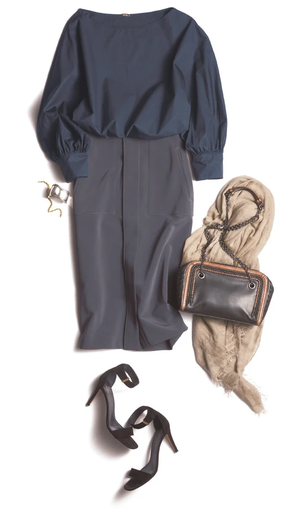 次はボトムスの色を変えると印象ががらりと変わります。STEP1がメリハリのある配色だったので、今回は対照的な同系色のコーディネイト。ツヤのあるチャコールグレーのタイトスカートを合わせ、ぐっとシックなイメージに!