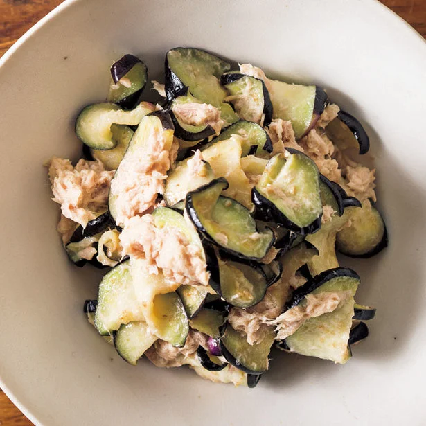 旬のなすはうまみが増しているので、バリエーションはいくらあっても困りません。ツナはマヨネーズとみそと混ぜれば、より濃厚な味わいに。なすの皮をむいて加熱すればきれいなひすい色になるので、食卓の彩り担当にぴったりです。