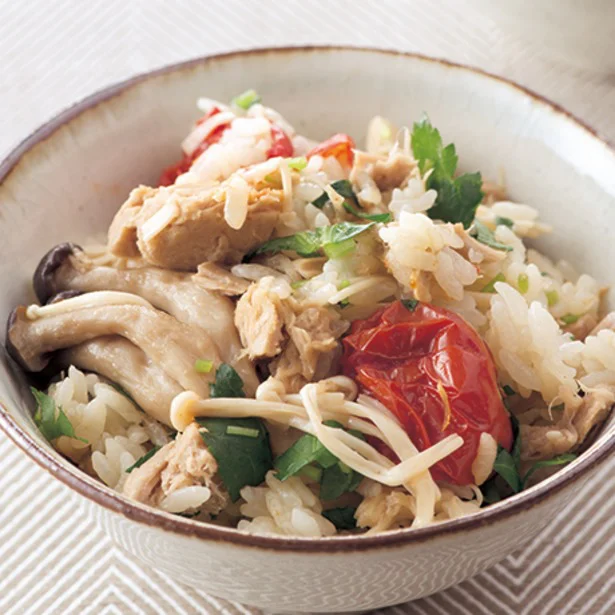 ツナは缶汁を軽くきりながら、缶から直接加えればOK。具も調味料も一緒に入れて炊くだけのラクチンメニューです。