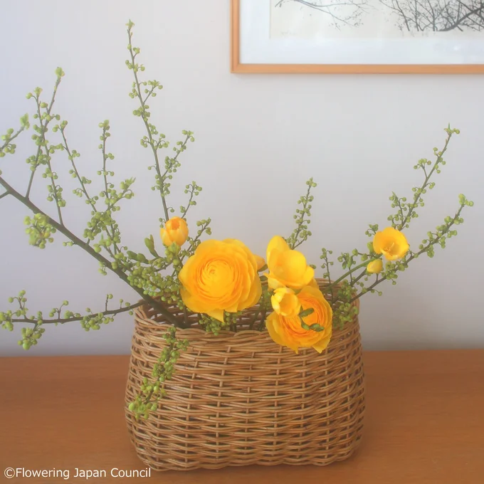 3、 黄色のフリージア、ランキュラスをバスケットの口元から溢れるようにあしらい、最後に白いフリージア、スイートピーをバランスよく配します。アオモジの枝が、ちょうどよく花留めの役目を果たしてくれます。