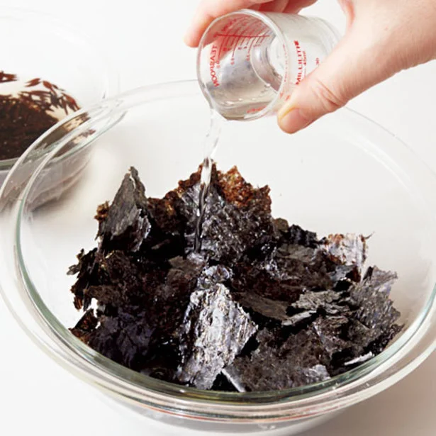 1.ひじきは袋の表示どおりにもどす。焼きのりは細かくちぎってボウルに入れ、水60mlを回しかけてさっと混ぜ、湿らせる。ひじきは水けをしっかりきる。