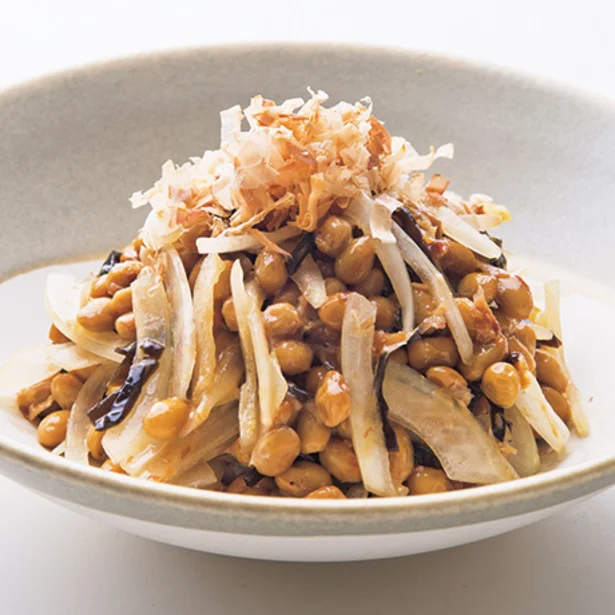 「納豆と玉ねぎの塩昆布おかかあえ」