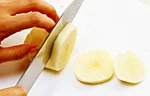 いつものおかずでは皮をむく必要はありませんが、正月のきんとんや、スイートポテトなどの菓子を作る場合は、皮を厚めに(約3mm)むきます。皮の近くは繊維が多いので、厚くむくことで、裏ごしなどをする場合もなめらかに、色よく仕上がります。