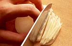 料理に応じた厚さの輪切りにしたものを重ねて、5~6mm幅に縦に切ります。