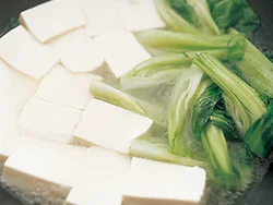 豆腐はペーパータオルに包んで皿などでおもしをし、約10分水きりをする。縦半分にして1.5cm幅に切る。チンゲン菜は六つ割りにし、長さを3等分に切る。