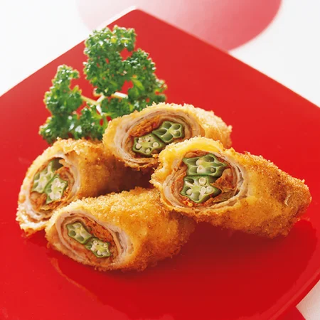 豚肉は3枚をずらして重ねるように並べ、手前にキムチ1/4量、オクラ2本を芯(しん)にしてのせ、ひと巻きして左右を折り込んで巻く。同様にあと3個作る。ころもを小麦粉、溶き卵、パン粉の順につける。
