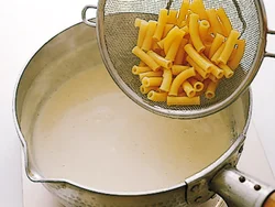 牛乳と片栗粉で作るソースは失敗なし! たっぷりのゆでたマカロニ、少々大きめに切ったとり肉でしっかりとした食べごたえに。